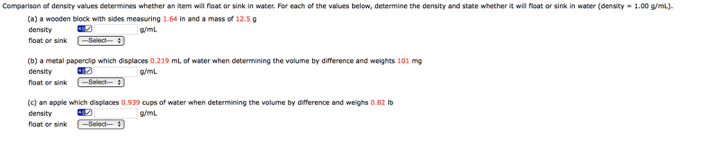 Water has a density of one. Liquids and solids with a density greater than one will sink. If the density of an object is less than one, then the object will float. Let's look at an example. Float or Sink? Powered by Create your own unique website with customizable templates. Get Started ... Relative Density - sink or float: Description Done to enhance concept after basic measuring and calculating is complete: Subject Chemistry, Other, Physics: Level Middle School: Type Homework, Lab: Answers Included No: Language English: Keywords density: Simulation(s) Density ... The more closely packed the atoms, the more density